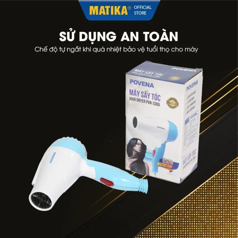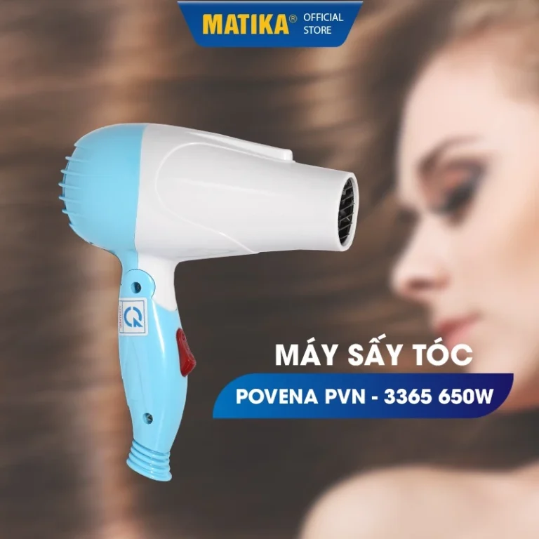 - Máy sấy tóc Povena PVN-3365 có kiểu dáng nhỏ gọn, đẹp mắt với tông màu xanh da trời và trắng, thiết kế gập đôi lại rất gọn có thể mang đi xa trong các chuyến du lịch…